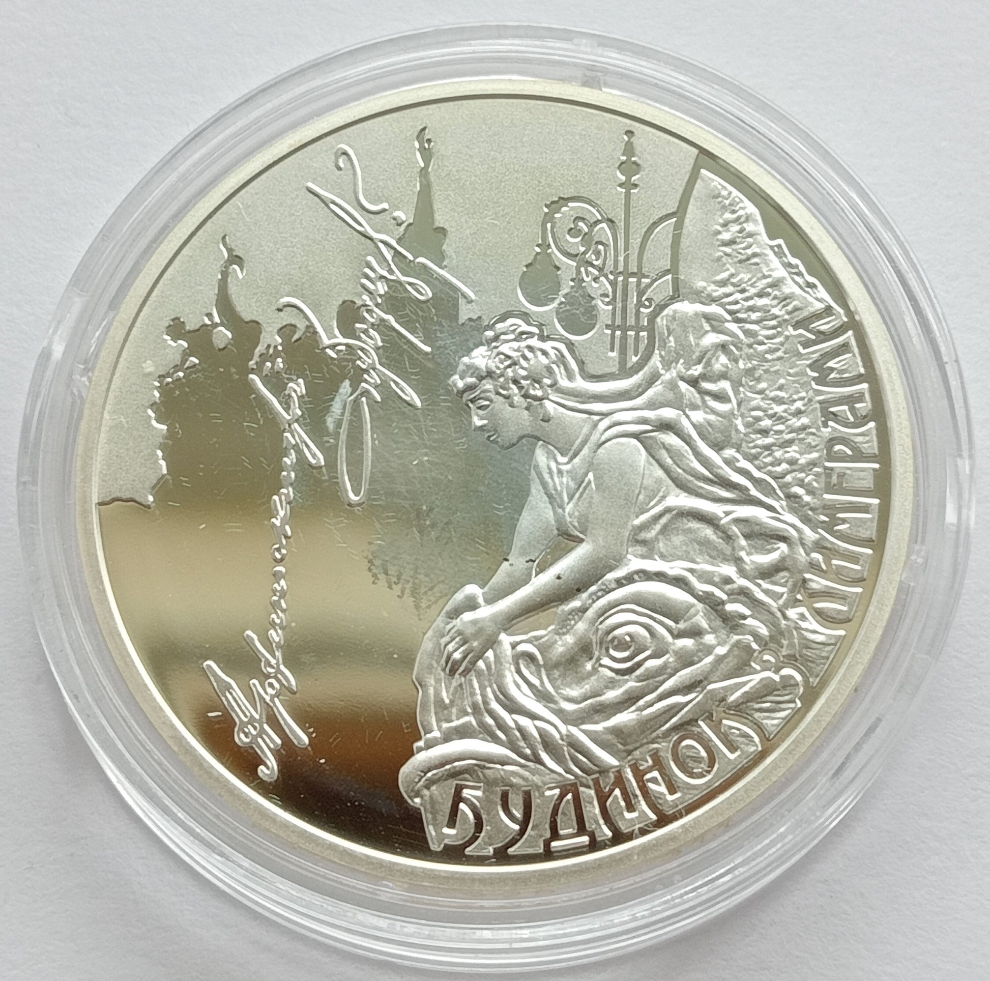 Rewers: na tle Domu z konturami Chimer fragment kompozycji rzeźbiarskiej w reliefie upiększającym fasadę Domu; po lewej stronie faksymile podpisu architekta (pionowo); po prawej stronie półkolem napis БУДИНОК З ХИМЕРАМИ (dom z chimerami).