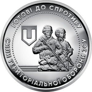 Rewers: Dwóch żołnierzy uzbrojonych w karabiny maszynowe, po lewej logo Wojsk Obrony Terytorialnej. Motto u góry Gotowi do oporu, u dołu motyw Siły Obrony Terytorialnej Sił Zbrojnych Ukrainy