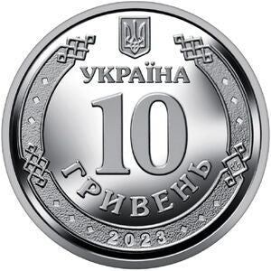 Awers: pośrodku duża cyfra nominału 10, waluta poniżej ГРИВЕНЬ (Hryven). U góry mały herb, poniżej kraju УКРАЇНА (Ukraina). Wokół zdobiona ramka, na dole data 2023, po prawej stronie znak mennicy w rombie „lilia”.