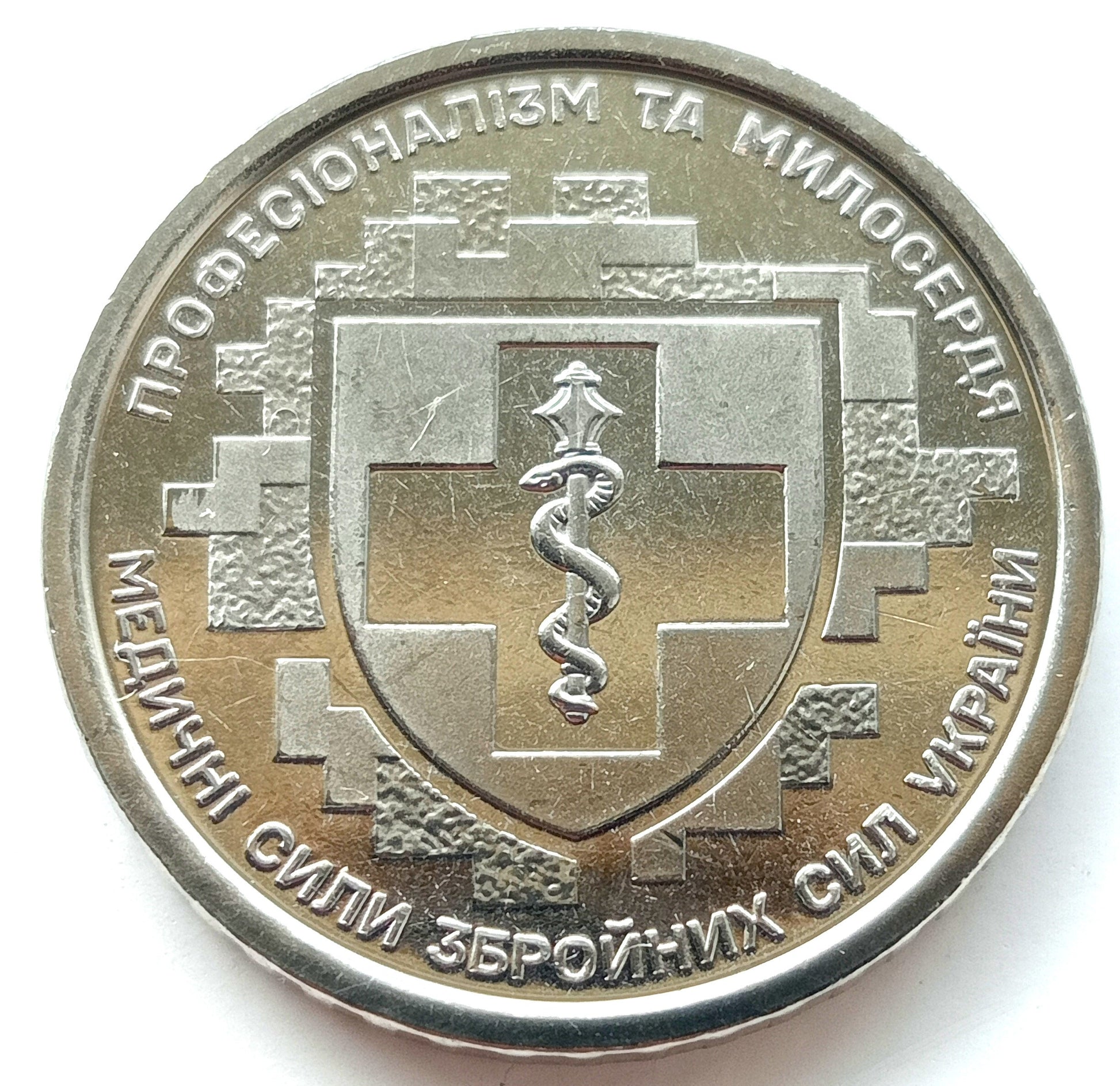 Rewers: Godło Dowództwa Oddziału Medycznego, zostało stworzone na podstawie brytyjskiej tarczy herbowej, jest przedstawione w reliefie. Centralnym elementem tarczy jest krzyż ze stylizowanym wężem owiniętym wokół pernacha. Krzyż symbolizuje znak wszechstronnej pomocy i ochrony, który jest uznawany w Europie i na świecie, a wąż owinięty wokół pernacha jest symbolem Oddziału Medycznego. W tle schematycznie przedstawiono piksele kamuflażu. Motyw na górze ПРОФЕСІОНАЛІЗМ ТА МИЛОСЕРДЯ na dole МЕДИЧНІ СИЛИ ЗБРОЙНИХ СИЛ УКРАЇ НИ (Profesjonalizm i miłosierdzie Oddział Medyczny Sił Zbrojnych Ukrainy).