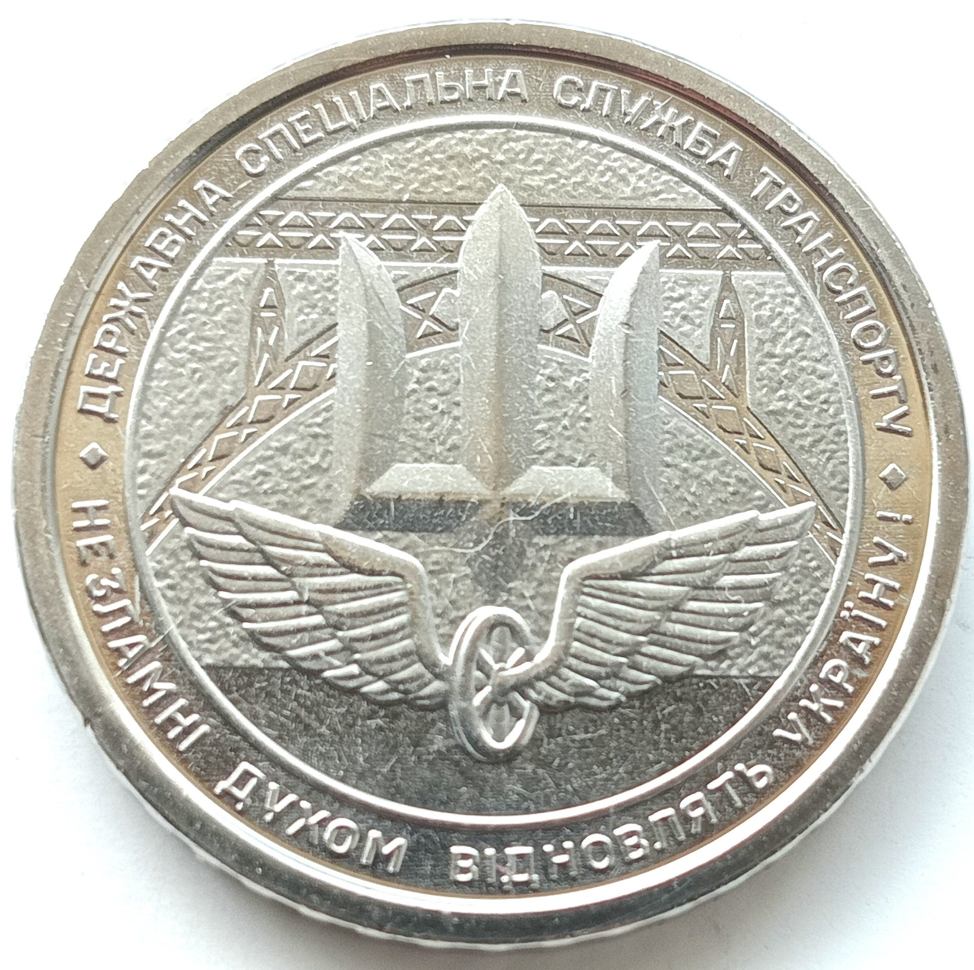 Rewers: Godło Służby Transportowej, trójząb, pod którym znajduje się uskrzydlone koło Merkurego. Ministerstwa Dróg Ukraińskiej Republiki Ludowej. Symbolizuje to dziedzictwo tradycji narodowych i specyfikę Służby Transportowej. W tle schematycznie przedstawiono most, symbolizujący infrastrukturę transportową Ukrainy i główną działalność Służby Transportowej, którą jest budowa i odbudowa infrastruktury krytycznej i transportowej Temat u góry ДЕРЖАВНА СПЕЦІАЛЬНА СЛУЖБА ТРАНСПОРТУ (Państwowa Specjalna Służba Transportowa), motto u dołu НЕЗЛАМНІ ДУХОМ ВІДНОВЛЯТЬ УКРАЇНУ! Niezłomni w duchu przywrócą Ukrainę