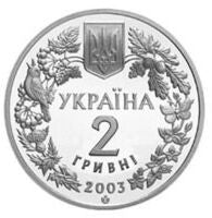 Awers: w wieńcu złożonym z wizerunków roślin i zwierząt wygrawerowane jest małe Godło Ukrainy oraz legenda: УКРАЇНА, 2, ГРИВНІ, 2003 (Ukraina/ 2/hrywna/ 2003) i logotyp NBU