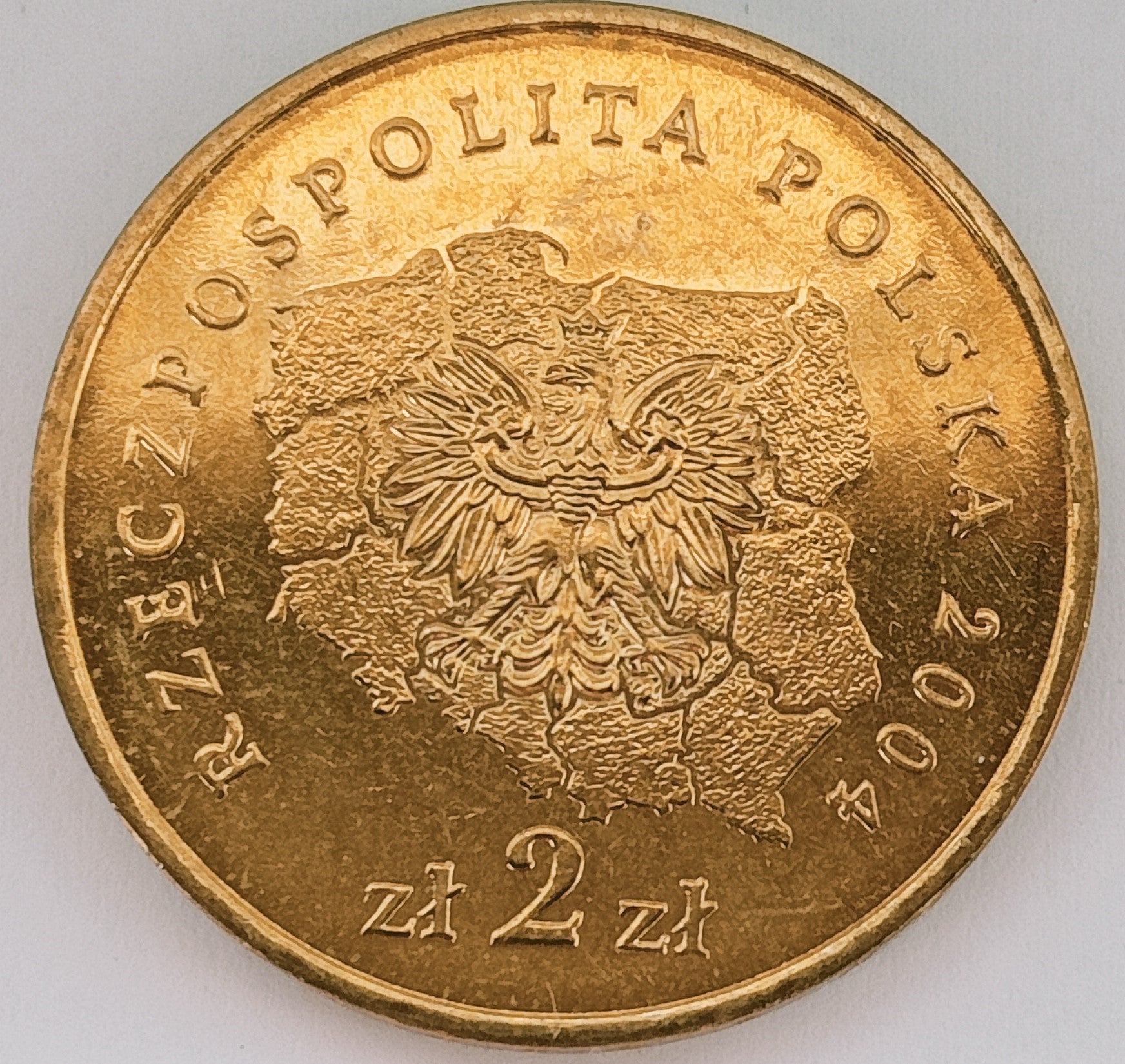 Na rewersie herb województwa lubuskiego. Składa się on z 2 części. Z lewej jest orzeł, natomiast z prawej dwie sześcioramienne gwiazdy. U góry napis "WOJEWÓDZTWO" na dole "LUBUSKIE". Na awersie zawarto dane emitenta. Półkoliście przy otoku jego nazwa RZECZPOSPOLITA POLSKA i rok emisji monety 2004. Na dole nominał "zł 2 zł". Centralnie orzeł biały ze znakiem menniczym pod łapą. Umieszczony jest na tle mapy z granicami polskich województw.