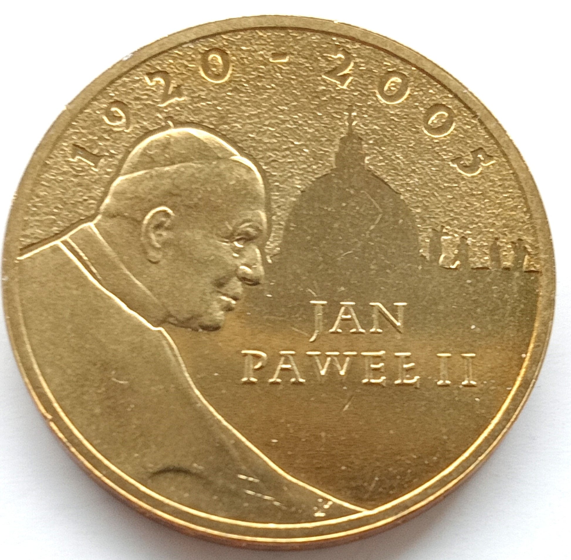 Okolicznościowa moneta o nominale 2 złotych poświęcona postaci Jana Pawła II. Na rewersie profil papieża, z prawej napis "JAN PAWEŁ II" na tle bazyliki świętego Piotra w Watykanie. U góry lata życia 1920-2005. Awers z orłem po środku dzielącym rok wybicia monety 2005 na dwie części, u góry nazwa państwa emitującego "RZECZPOSPOLITA POLSKA", a na dole nominał "zł 2 zł".