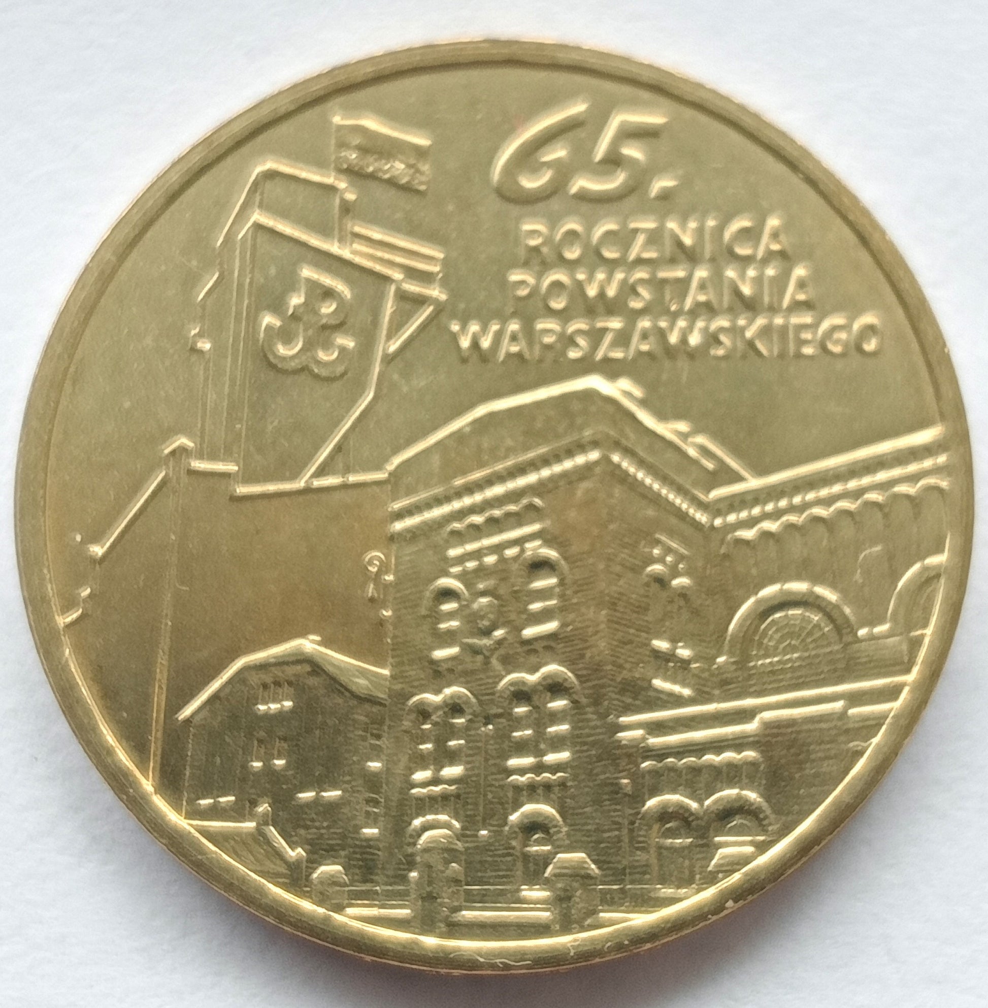 Na rewersie widnieje tematyczny napis "65. ROCZNICA POWSTANIA WARSZAWSKIEGO". Poniżej istniejące obecnie muzeum tego wydarzenia. Na awersie orzeł biały rozdzielający rok emisji, pod jego łapą znak mennicy w Warszawie. Na dole nominał "zł 2 zł", a góry nazwa RZECZPOSPOLITA POLSKA.
