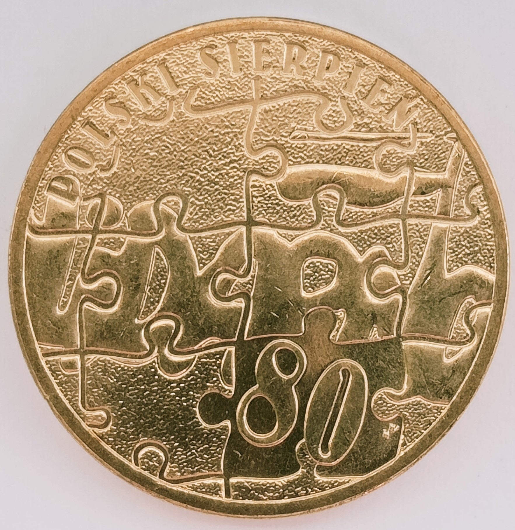 Motywem rewersu jest fragment napisu "SOLIDARNOŚĆ" z puzzli. W górnej części napis "POLSKI SIERPIEŃ". W pustym polu przy puzzlach "80". Na awersie od góry RZECZPOSPOLITA POLSKA, niżej godło RP, dzielące rok emisji 2010 na 2 części. Pod łapą orzeł ma znak mennicy. Na dole nominał "zł 2 zł".