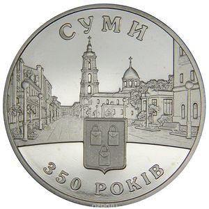 Rewers: przedstawiona jest główna ulica miasta z katedrą Zbawiciela i Przemienienia Pańskiego, na tle ulicy herb miasta Sumy oraz półokrągłe napisy: СУМИ (Sumy) (powyżej), 350 РОКІВ (350 Rok ) - pod