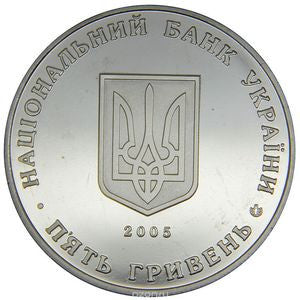 Awers: w centrum godło Ukrainy, pod nim - 2005 rok, rok emisji monety oraz okrągłe napisy: НАЦІОНАЛЬНИЙ БАНК УКРАЇНИ (Narodowy Bank Ukrainy) oraz ПЯТЬ ГРИВЕНЬ (5/ hrywien) (u dołu) i logotyp Mennicy Narodowego Banku Ukrainy
