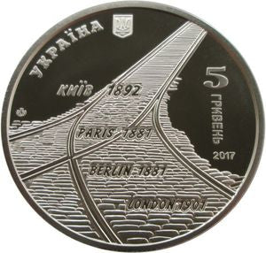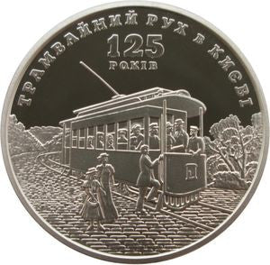 Awers: u góry mały herb Ukrainy, po lewej stronie półokrągła legenda УКРАЇНА (Ukraina); po prawej nominał monety 5 ГРИВЕНЬ (5 hrywien) (pisany pionowo) oraz rok emisji monety 2017; skonwencjonalizowana kompozycja: tory tramwajowe na kamiennym chodniku wznoszące się ku niebu jako symbol postępu i legendy КИЇВ (Kijów) 1892/ PARYŻ 1881/ BERLIN 1881/ LONDYN 1901 (miasta i lata w których były uruchomiona); znajduje się tam znak mennicy Wytwórni Banknotów NBU.
