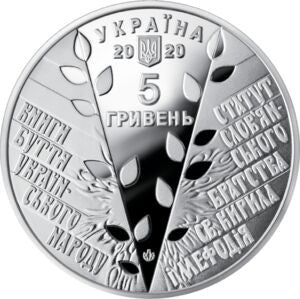 Awers: Na górze godło państwowe Ukrainy, między rokiem „20 20”, nad godłem napis „УКРАЇНА” pod herbem nominał „5/ГРИВЕНb”;z lewej i prawej strony napisy i stylizowane pędy z liśćmi, napisy na matowym tle: „КНІГІ / БУТТЯ / УКРАЇН- / СЬКОГО / НАРОДУ” (Książki / Byt / Ukranian / Lud) (lewa), „СТАТУТ / СAОВА'ЯН- / СЬКОГО / БРОТЕРВА / СB / КИРИAА / І МЕФОДІЯ” (Statut/Słowo-/Słowiańskie/Braterskie/Św. Cyryl/ i Metody