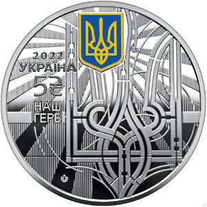 Awers: Na tle promieni stylizowany Znak Państwa Książęcego Włodzimierza Wielkiego, którego wizerunek odtwarza konstrukcję trójzębu; małe kolorowe godło państwowe Ukrainy, z lewej strony data, nazwa państwa i nominał 2022 / УКРАЇНА / 5 ₴ (2022 Ukraina 5 hrywien) oraz nazwa НАШ / ГЕРБ (herb nasz) oraz logo banknotu i Mennicy Ukrainy Narodowy Bank Ukrainy.