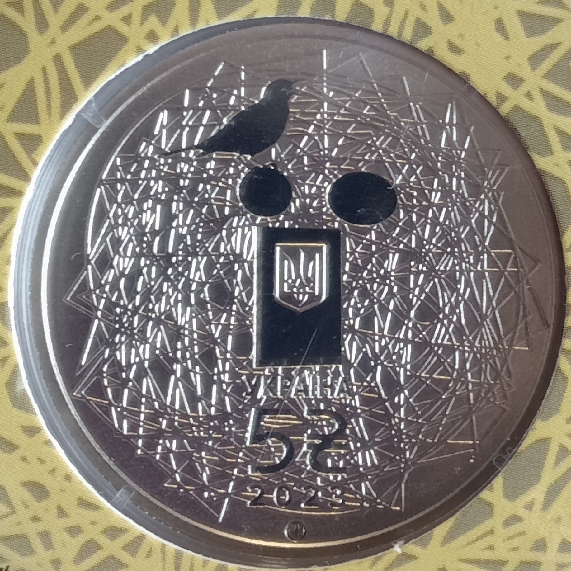 Awers: Stylizowana litera Ї ze słowikiem u góry, symbolizująca melodię i śpiew języka ukraińskiego, pośrodku litery znajduje się małe godło państwowe Ukrainy; u dołu nominał 5 ₴ i data poniżej 2023. W tle faktura z konturów liter ukraińskiego alfabetu. U dołu logo Mennicy Banknotowej Narodowego Banku Ukrainy (lilia).