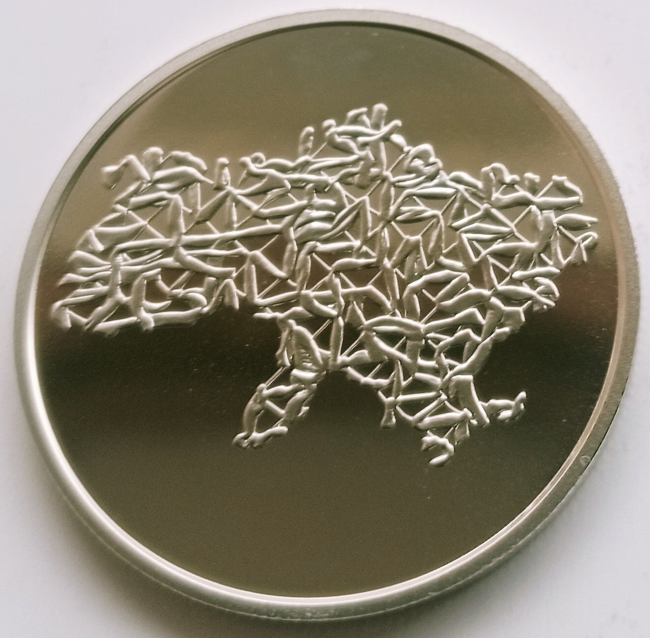 Rewers: Stylizowana mapa Ukrainy w formie siatki maskującej jako symbol zjednoczonego kraju, który jest „spleciony” i zjednoczony dla osiągnięcia wspólnego celu – Zwycięstwa.