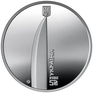 Awers: Kompozycja symbolizująca Ukrainę. Symbol trójzębu, który oznacza nowość i ucieleśnia nowoczesne trendy Na gładkim tle widać ostrze miecza. U góry małe godło państwowe Ukrainy, po prawej stronie państwo w pionie (Ukraina), u dołu data 2023 i nominał poniżej (5 Hryven), w lewym dolnym rogu znak mennicy (lilia).