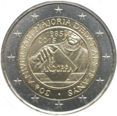 W 1985 roku Andora uznała osoby kończące 18 rok życia za zdolne do udziału w wyborach. W 30 rocznicę tych ustaleń wyemitowała okolicznościowe monety. W centralnej części awersu widnieje postać wrzucająca do urny kopertę. Na niej nazwa państwa emitującego "ANDORRA" ("ANDORA"). Przy twarzy postaci lata 1985 i 2015. Wzdłuż otoku hasło „30è ANIVERSARI MAJORIA D’EDAT ALS 18 ANYS” („30 ROCZNICA PEŁNOLETNOŚCI W WIEKU 18 LAT”).