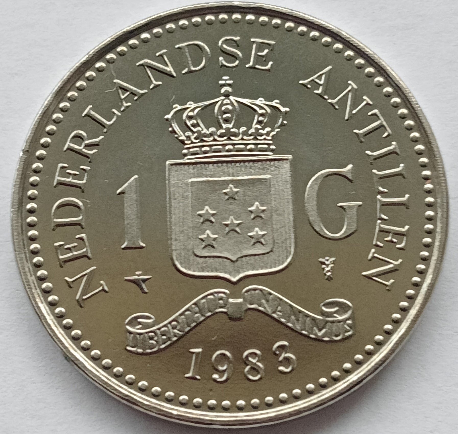 Awers: godło pomiędzy wartość nominalna 1 oraz G (Gulden) i znaki mennicy z lewa i prawa Legenda: (nazwa kraju) NEDERLANDSE ANTILLEN (u dołu, rok) 1980 - 1985