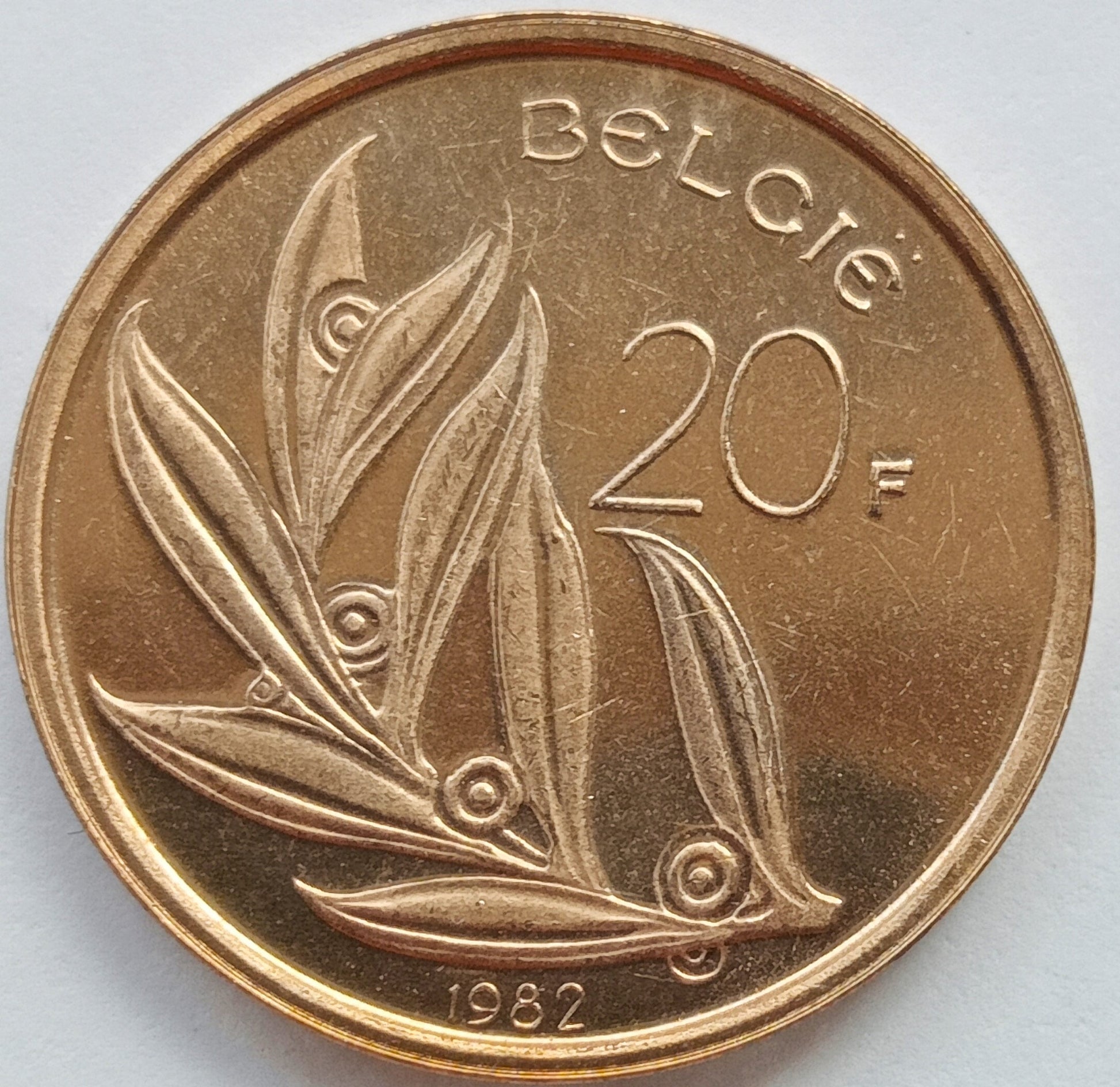 Awers: Stylizowana gałązka oliwna z 8 liśćmi na lewo od wartości nominalnej 20 ˹F˺ (Franków) Legenda (Francja): (góra -prawa, nazwa stanu) BЄLGIQVЄ (u dołu, rok) 1980 do 1982, 1989 do 1993 Rewers: Głowa 5-go króla Baudouina, projektant, poniżej (Harry Elstrom) pomiędzy znakami mennicy.