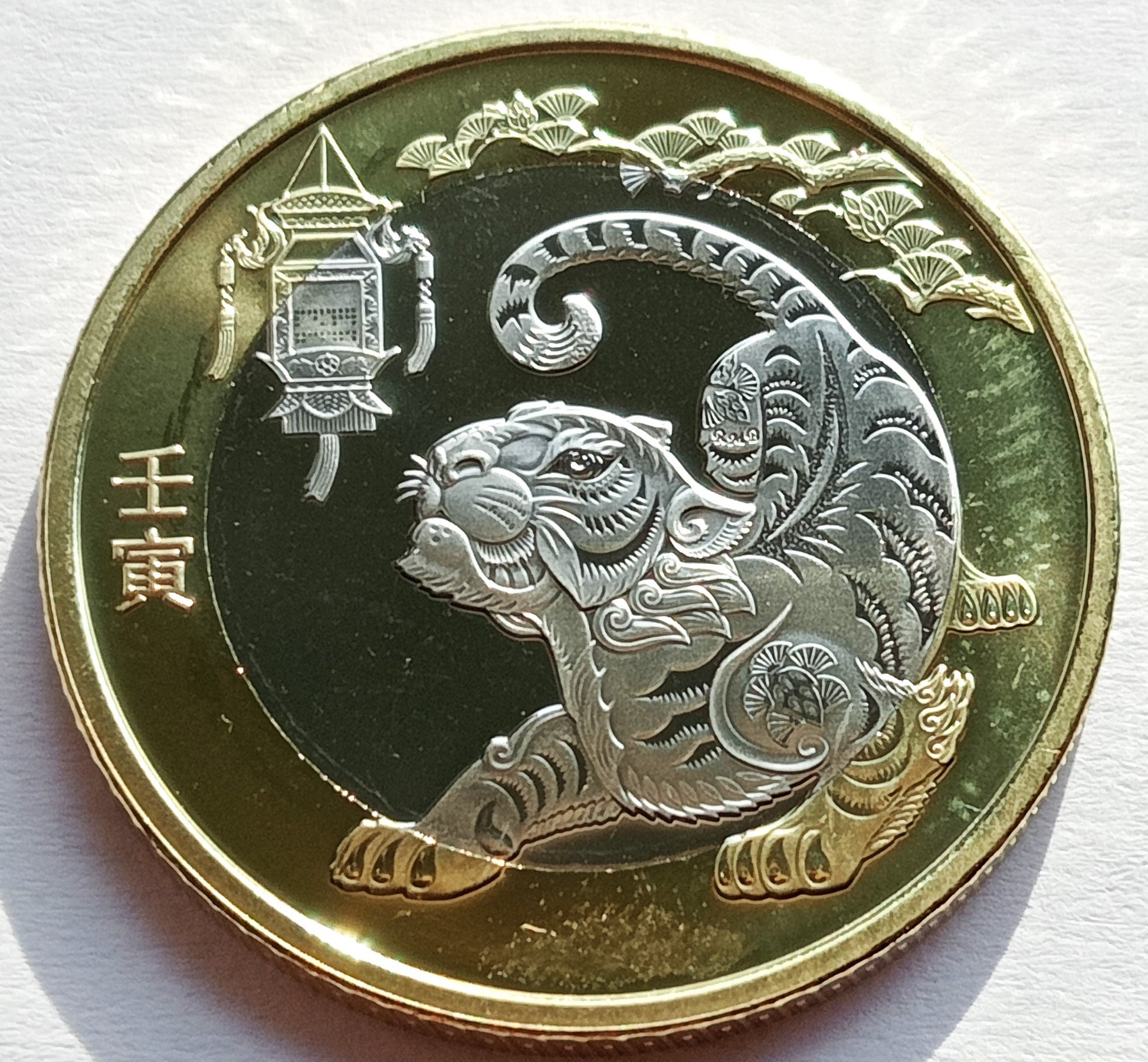 Rewers: Tradycyjny papierowy tygrys. Powyżej pokazano pałacową latarnię i ziarna. Chińskie symbole