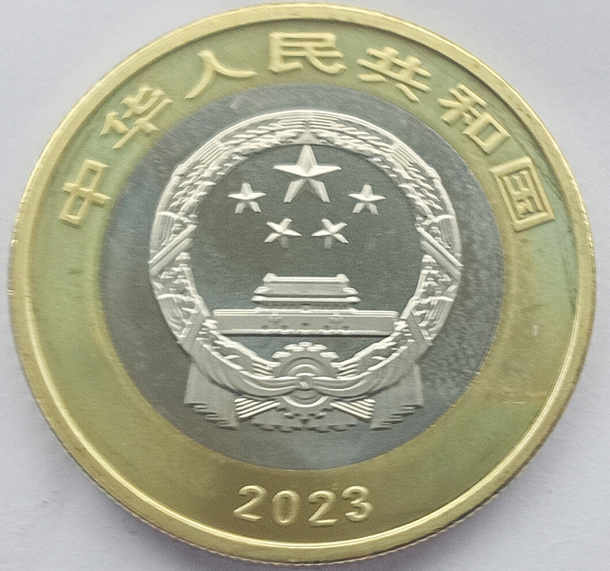 Awers: Godło narodowe, Tian'anmen, „Brama Niebiańskiego Pokoju”, brama do Zakazanego Miasta, nad nią 5 gwiazdek. Emitent na górze (Chińska Republika Ludowa), data na dole 2023.