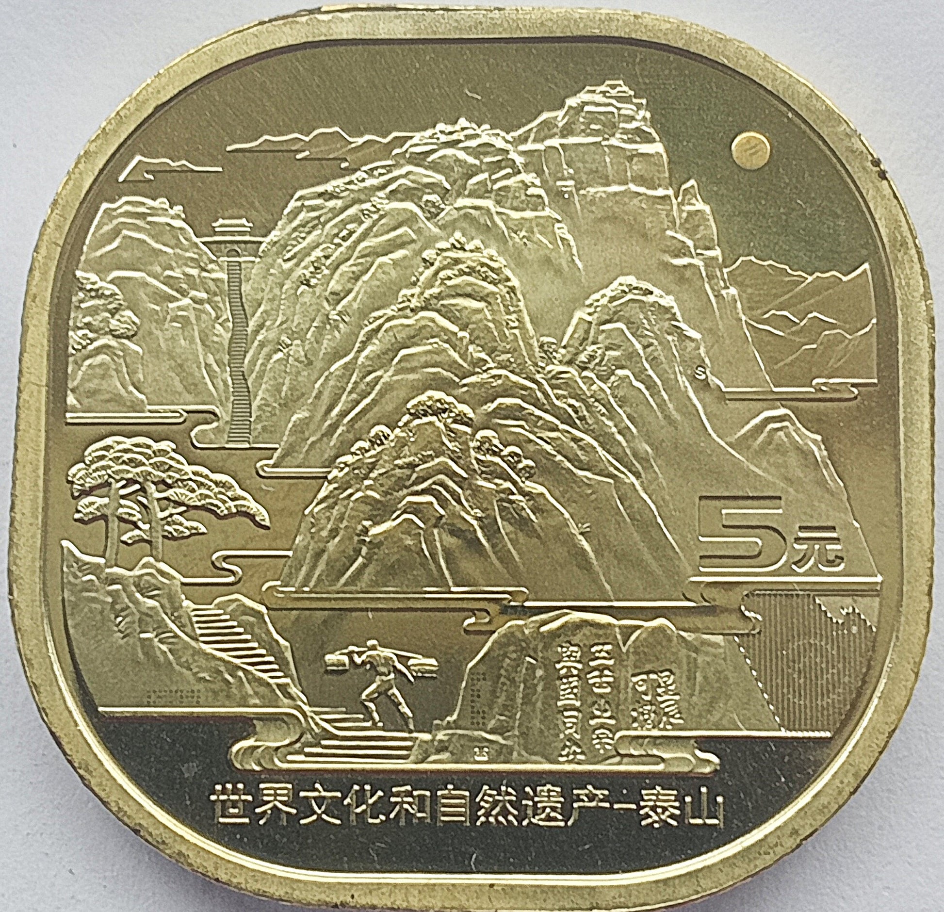 Rewers: Góra Taishan, wartość 5 juanów i przedmiot Światowego dziedzictwa kulturowego i naturalnego – Góra Taishan