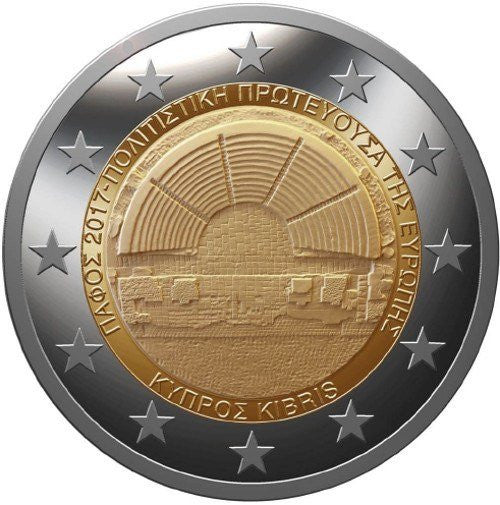 Pafos to nadmorskie miasto w południowo-zachodnim Cyprze i stolica dystryktu o tej samej nazwie. Jest ważnym miejscem w historii tego kraju, dlatego ruiny Odeonu (miejsce występów) z tego miejsca uwieczniono na jednej z monet euro. Naokoło po grecku i turecku nazwa państwa emitującego i rok emisji 2017.