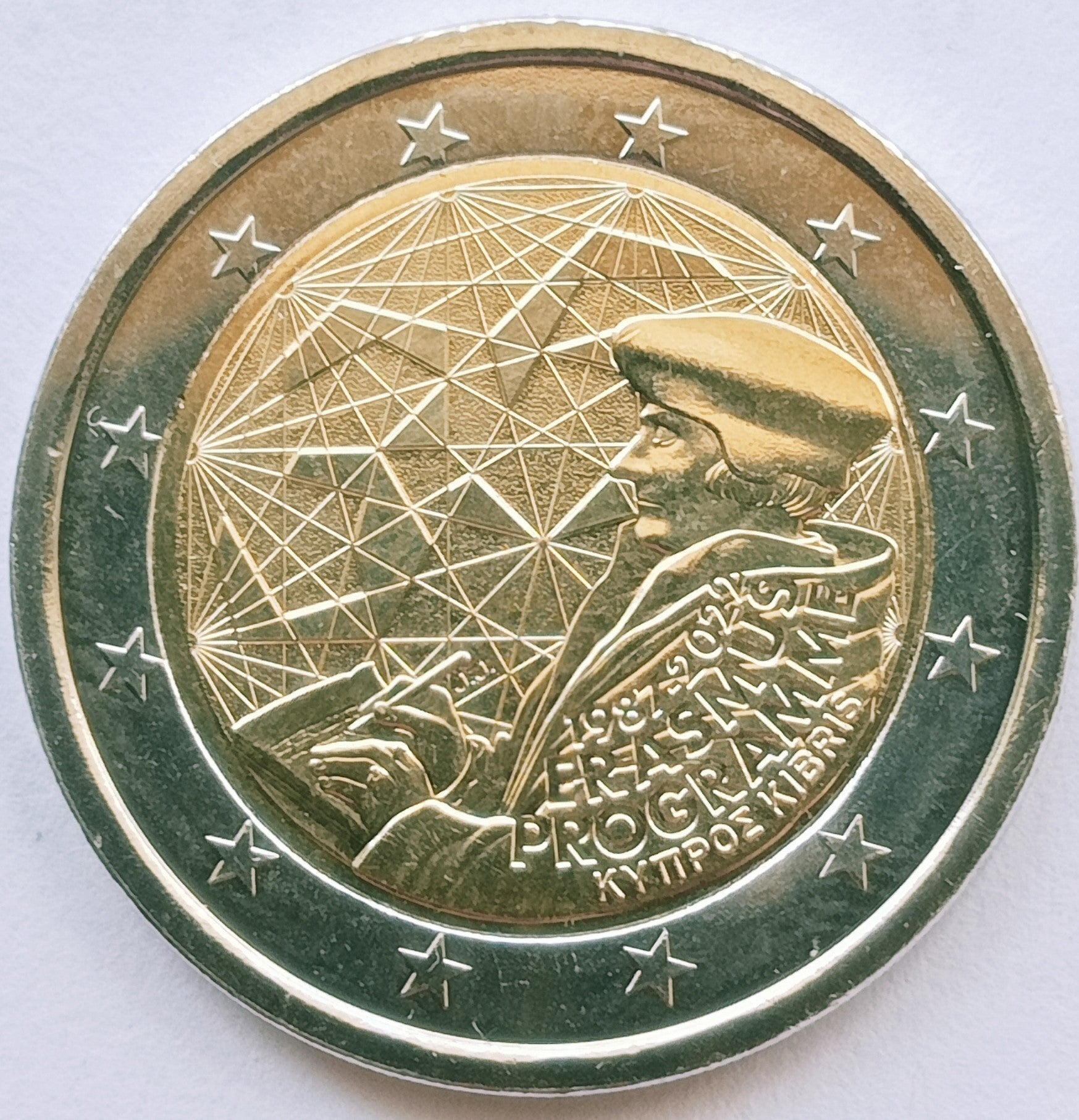 Awers: kompozycja dwóch elementów figuratywnych Programu Erasmus: oryginalnej inspiracji wielkiego teologa, humanisty i filozofa Erazma z Rotterdamu, Szereg łączących linii przecinających monetę, co stanowi alegorię wymiany intelektualnej i międzyludzkiej pomiędzy europejskimi studentami. W tym splocie liczba 35 wskazuje lata, jakie minęły od narodzin programu Erasmus. Po prawej stronie, w kształcie łuku, daty 1987-2022 Programu Erasmus i rok emisji monety oraz napis ERASMUS PROGRAMME, kraj ΚΥΠΡΟΣ KIBRIS; w centrum monety JJ, inicjały, wokół, dwanaście gwiazd Unii Europejskiej.
