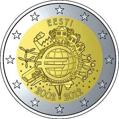 Chociaż sam system euro został wprowadzony w 1999 roku to monety i banknoty zaczęły obowiązywać wspólnie w całej strefie dopiero 3 lata później. Z okazji 10-lecia banknotów i monet euro wyemitowano monety okolicznościowe. Monety wszystkich emitentów były identyczne, różniły się tylko oznaczeniami w językach krajowych. W wersji estońskiej jest to nazwa EESTI. Pod nią kula ziemska z budynkami istotnymi dla działania strefy euro. Sam glob połączony jest z symbolem euro.