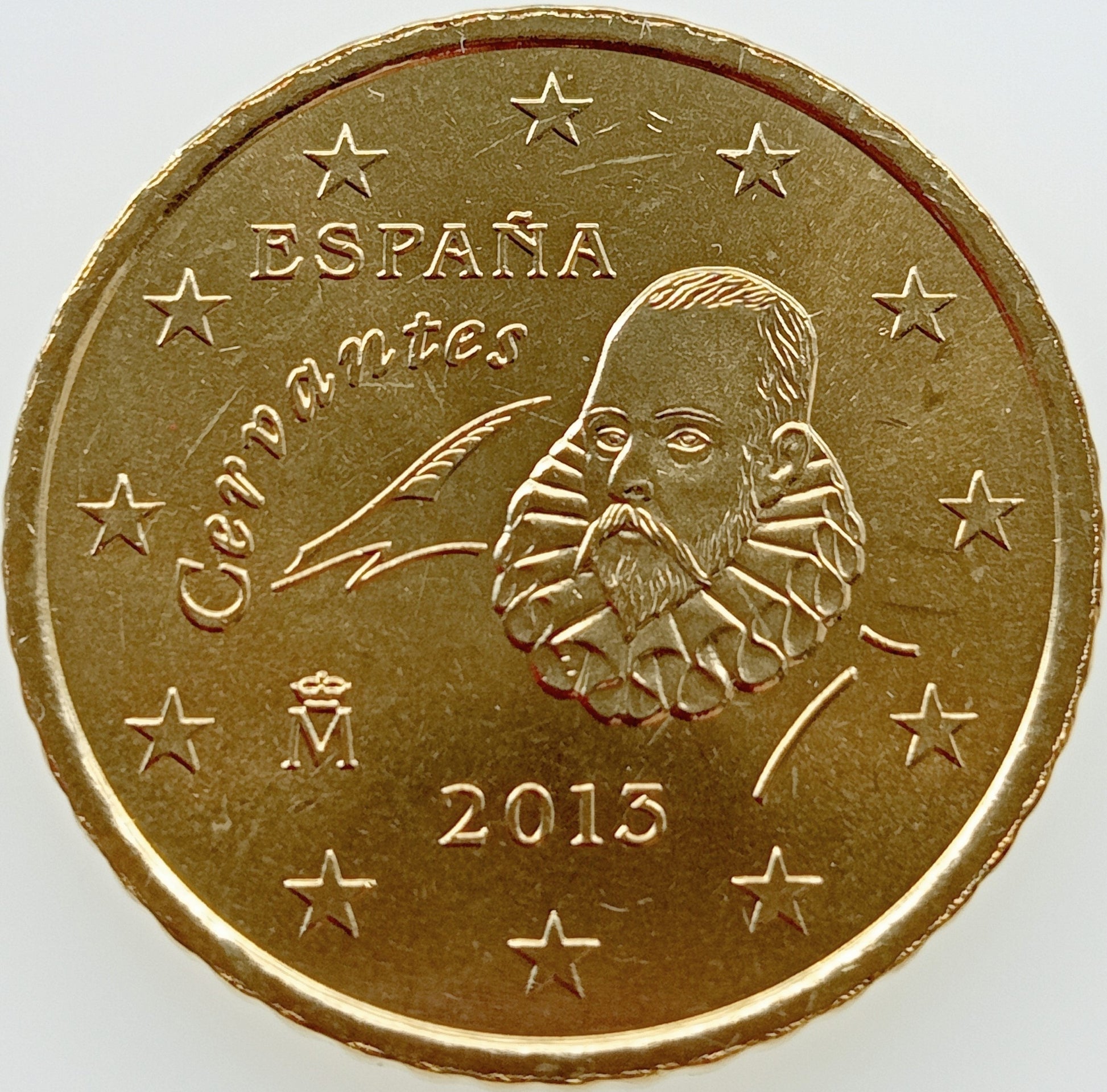 Rewers: Popiersie pisarza Miguela de Cervantesa w prawo, o łukowatym imieniu Cervantes i pióro; U góry nazwa państwa ESPAÑA (Hiszpania), u dołu rok od 2013 do dziś, w lewym dolnym rogu znak mennicy (Mennica Hiszpańska, Madryt). Wokół dwanaście pięcioramiennych gwiazdek