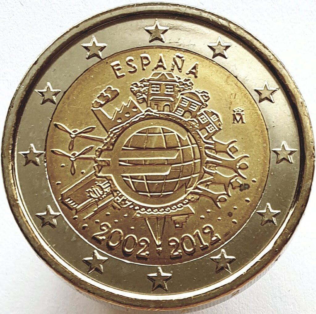 Moneta okolicznościowa poświęcona 10-leciu wprowadzenia do obiegu fizycznych pieniędzy euro. Jej centralnym motywem jest glob połączony ze znakiem (€). Na nim postacie ludzkie z uniesionymi w górze rękoma oraz budynki. U góry nazwa państwa emitującego „ESPAÑA” ("HISZPANIA"), u dołu lata 2002-2012, z prawej oznaczenie mennicy "M".