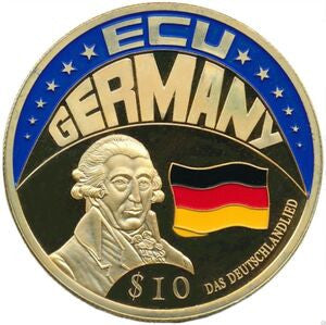 Rewers: Popiersie po prawej i kolorowa flaga, wartość i motyw „$10 DEUTSCHLANDLIED”, nazwa serii dzieli się na 12 gwiazdek „ECU”, Temat „GERMANY”