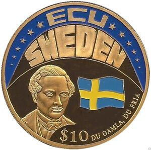 Rewers: Popiersie po prawej i kolorowa flaga, wartość i motyw „$10 DU GAMLA, DU FRIA”, nazwa serii dzieli się na 12 gwiazdek „ECU”, Temat „SZWECJA”