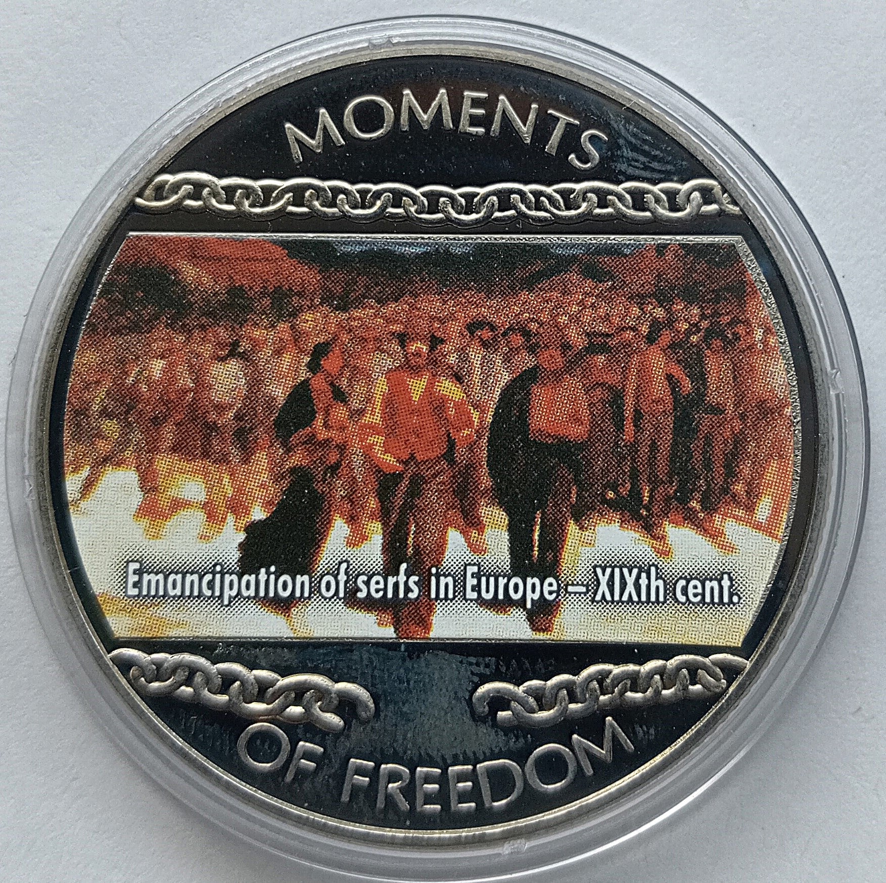 Aewers: Ludzie wyrywający się na wolność, między łańcuchami (na dole zerwany łańcuch), Temat "Emancypacja chłopów pańszczyźnianych w Europie - XIX w.", nazwa serii; "MOMENTS OF FREEDOM"
