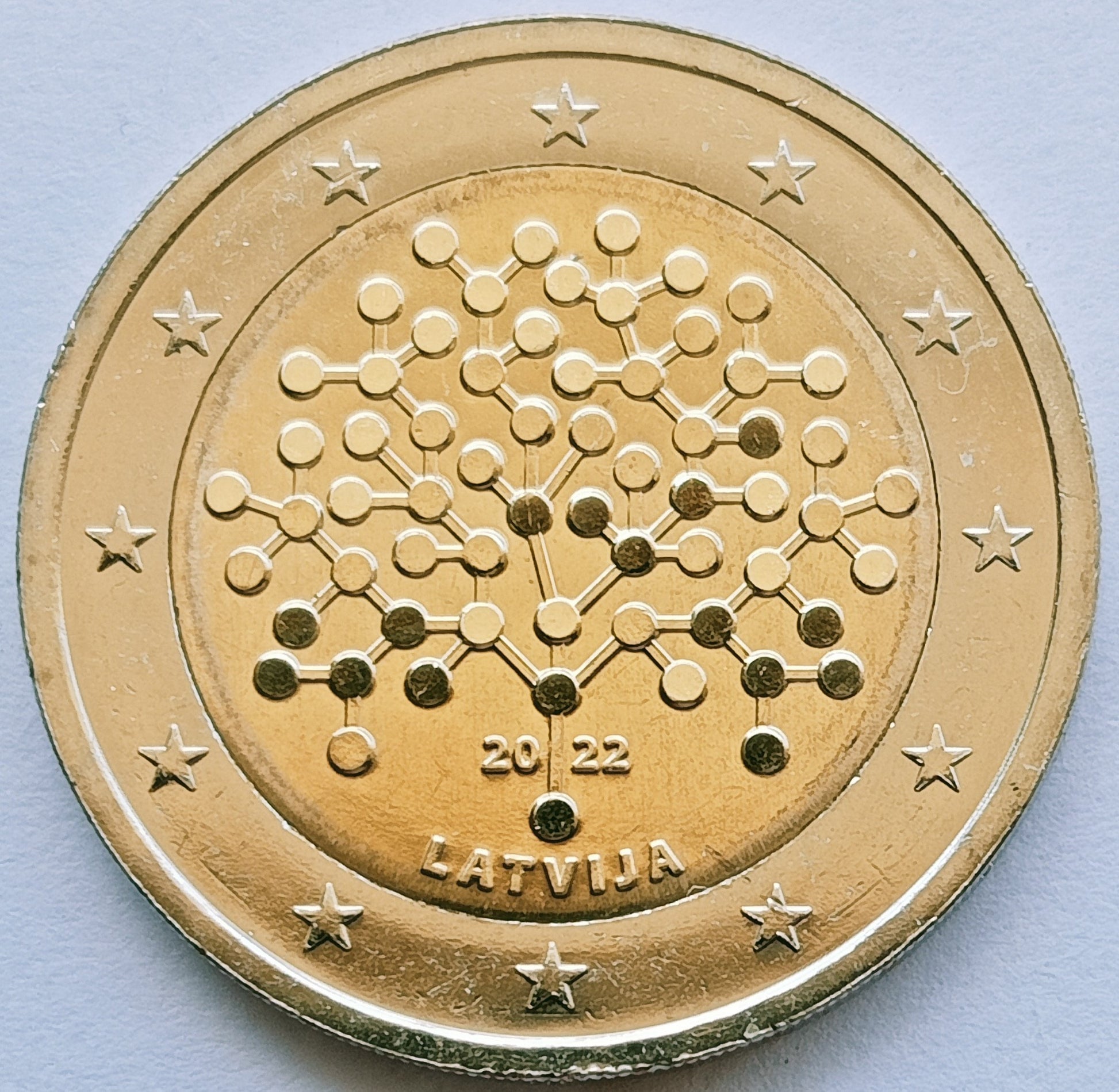 Awers: przedstawia stylizowane drzewo symbolizujące wiedzę finansową i dobrobyt. W dolnej części monety wygrawerowana jest nazwa kraju ŁOTWA (Łotwa) oraz rok emisji 2022.