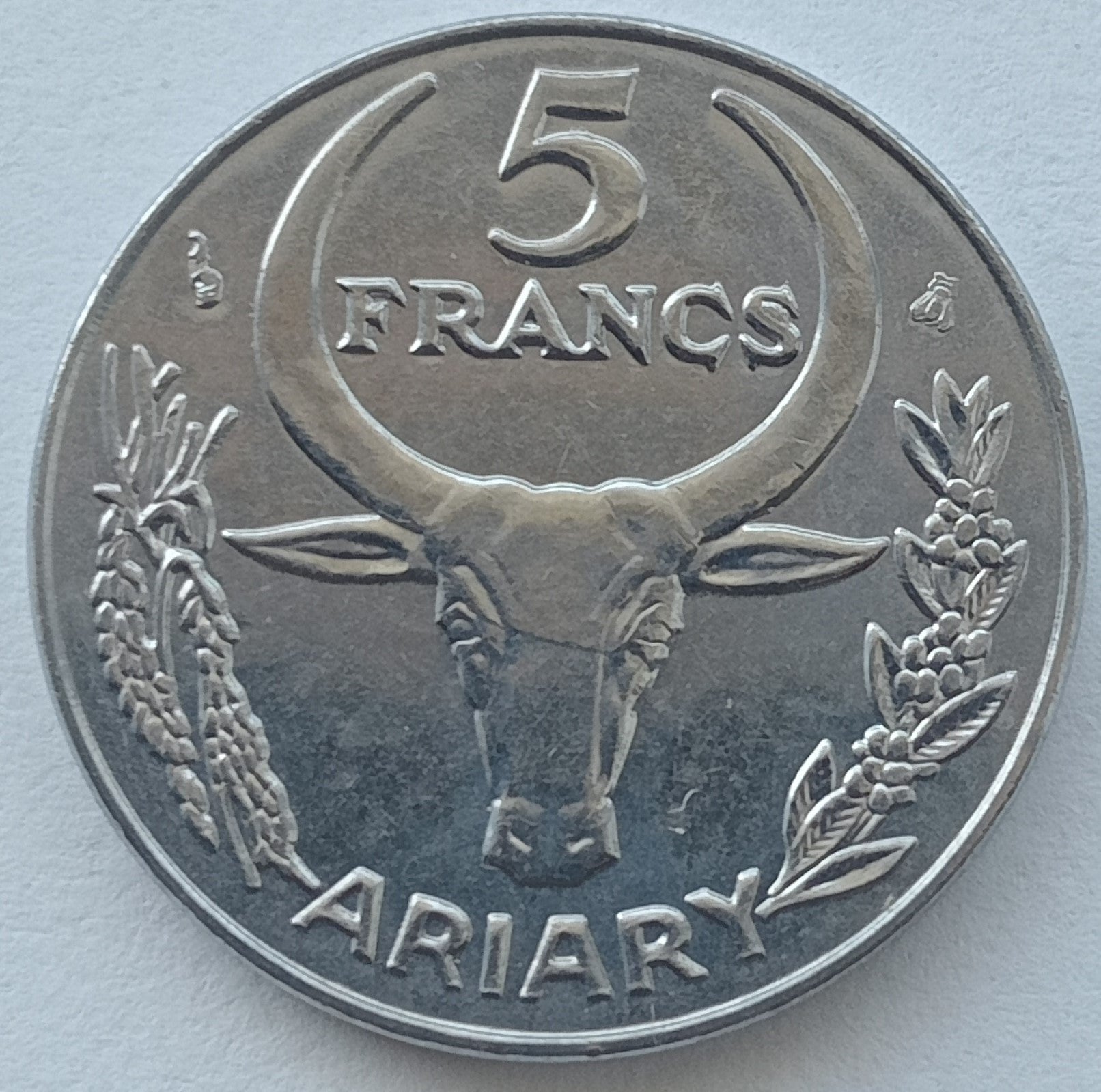 Awers: Głowa Zebu (bydło domowe) poniżej (wartość ) 5 FRANKÓW