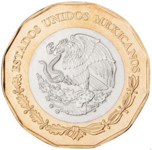 Awers: Pośrodku, meksykański orzeł siedzący na opuncji kaktusowej pożerającej węża, w rzeźbionym reliefie, nazwa kraju ESTADOS UNIDOS MEXICANOS (Meksykańskie Stany Zjednoczone)