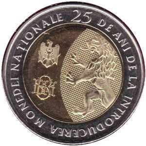 Awers: tło monety podzielone jest na dwie części, przypominające słońce i księżyc, symbol ciągłości czasu, przeszłości i teraźniejszości; po prawej figura lwa z lewej strony – część herbu Republiki Mołdawii i logo BNM; w exergue, po obwodzie monety, wygrawerowany napis „25 DE ANI DE LA INTRODUCEREA MONEDEI NAȚIONALE”.