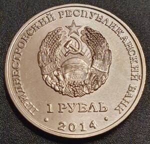 Awers; W centrum – godło Naddniestrzańskiej Republiki Mołdawii; w otoku napis: u góry – «ПРИДНЕСТРОВСКИЙ РЕСПУБЛИКАНСКИЙ БАНК» (Naddniestrzański Bank Republikański), u dołu – rok emisji „2014”wyżej - nominał; 1 РУБЛЬ» (1 rubel.).