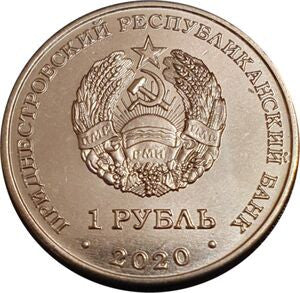Awers: Godło Naddniestrzańskiej Republiki Mołdawskiej, nominał i data poniżej; ПРИДНЕСТРОВСКИЙ РЕСПУБЛИКАНСКИЙ БАНК (Naddniestrzański Bank Republikański), wartość nominalna 1 РУБЛЬ oraz dane 2020