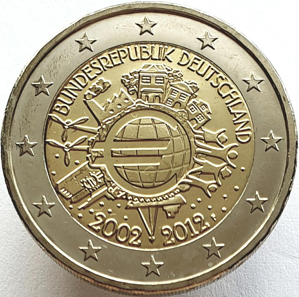 Okolicznościowa moneta o nominale 2 euro dotycząca 10-lecia korzystania z fizycznych pieniędzy euro. Wyemitowana przez wiele krajów strefy. Awers zaprojektował Helmut Andexlinger. Jego projekt został wybrany przez obywateli wspólnej unii monetarnej Przedstawił w sposób symboliczny kulę ziemską połączoną ze znakiem euro, a na nich ludzi oraz budynki. Na dole lata 2002-2012, u góry nazwa państwa emitującego „BUNDESREPUBLIK DEUTSCHLAND” („REPUBLIKA FEDERALNA NIEMIEC")