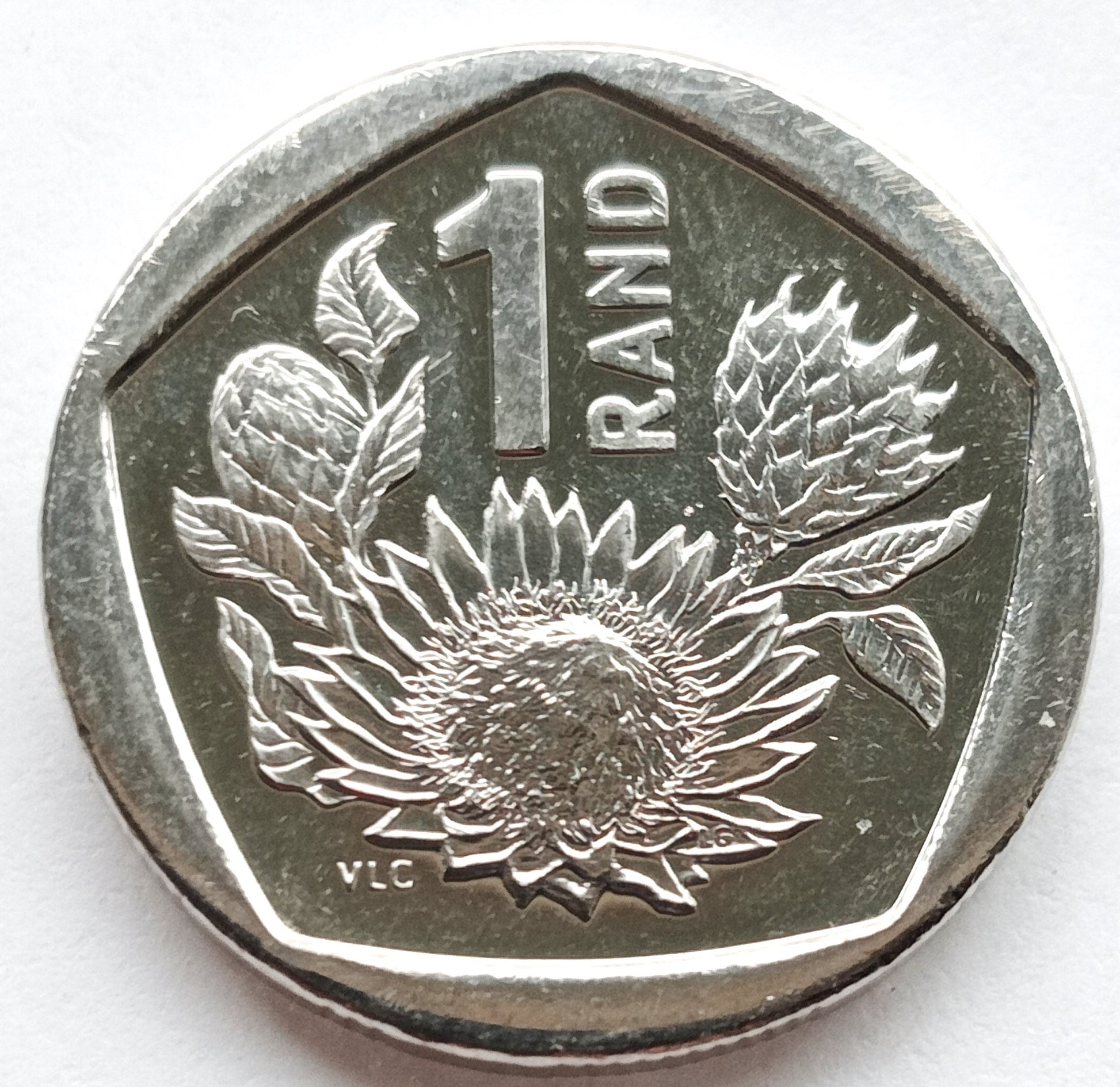 Awers: Kwiaty protei, u dołu po lewej, projektant VLC, nominał u góry 1, waluta w pionie RAND.