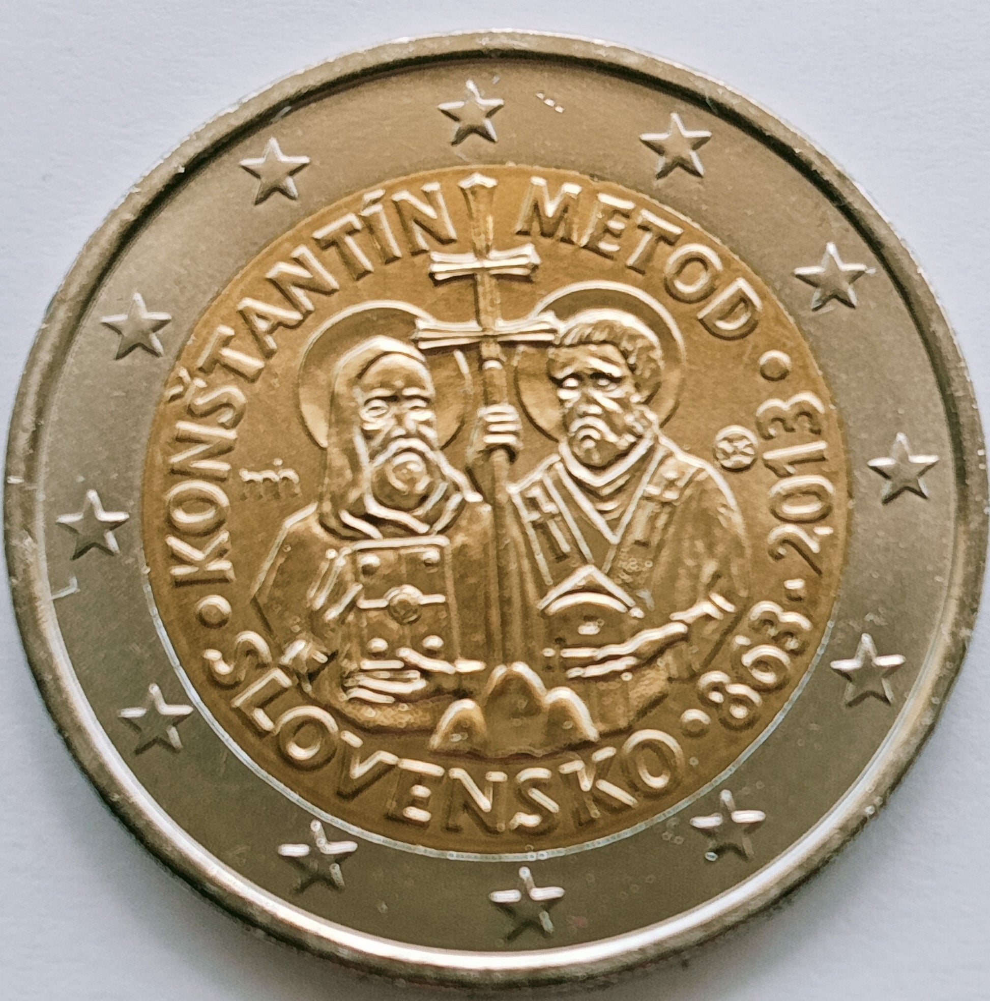 Cyryl i Metody byli misjonarzami z Salonik, którzy prowadzili wiele misji mających na celu zachęcanie do konwersji wiary. Przyczynili się również do powstania pierwszego słowiańskiego państwa. Zostali upamiętnieni na okolicznościowej monecie o nominale 2 euro ze Słowacji. Na awersie ukazane są ich postacie - Cyryl z książką, Metody z miniatura kościoła. W górnej części napisy „KONŠTANTÍN” („CYRYL”) I „METOD” („METODY”). U dołu oznaczenie emitenta „SLOVENSKO” („SŁOWACJA”) oraz lata „863” i „2013”. Z lewej strony oznaczenie autora projektu awersu Miroslava Hrica, a z prawej mennicy w Kremnicy.