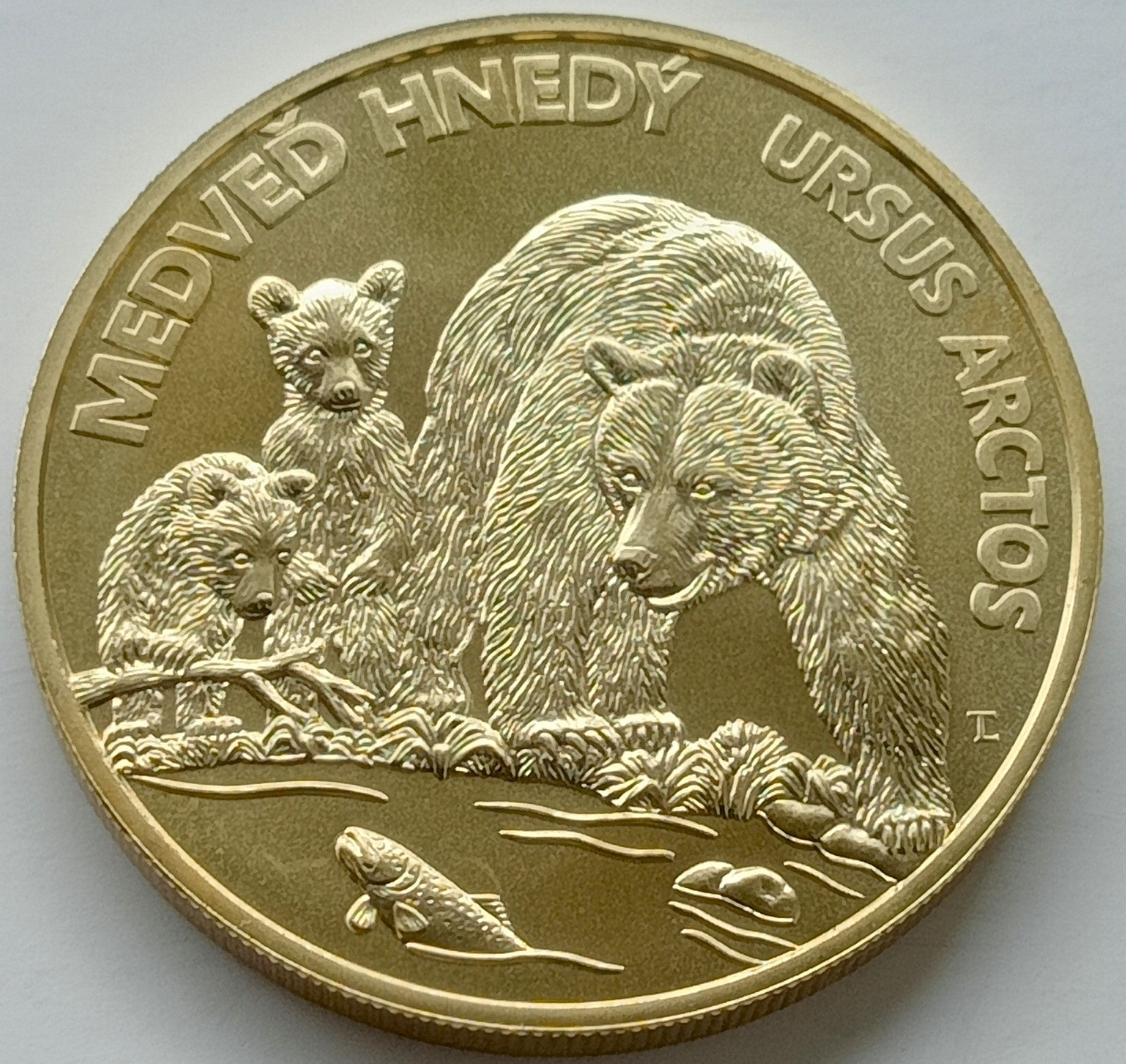Rewers: Niedźwiedzica z dwójką młodych łowiących ryby w rzece. U góry motyw w języku słowackim MEDVEĎ HNEDÝ (niedźwiedź brunatny) i nazwa naukowa URSUS ARCTOS, projektant w lewym dolnym rogu TL
