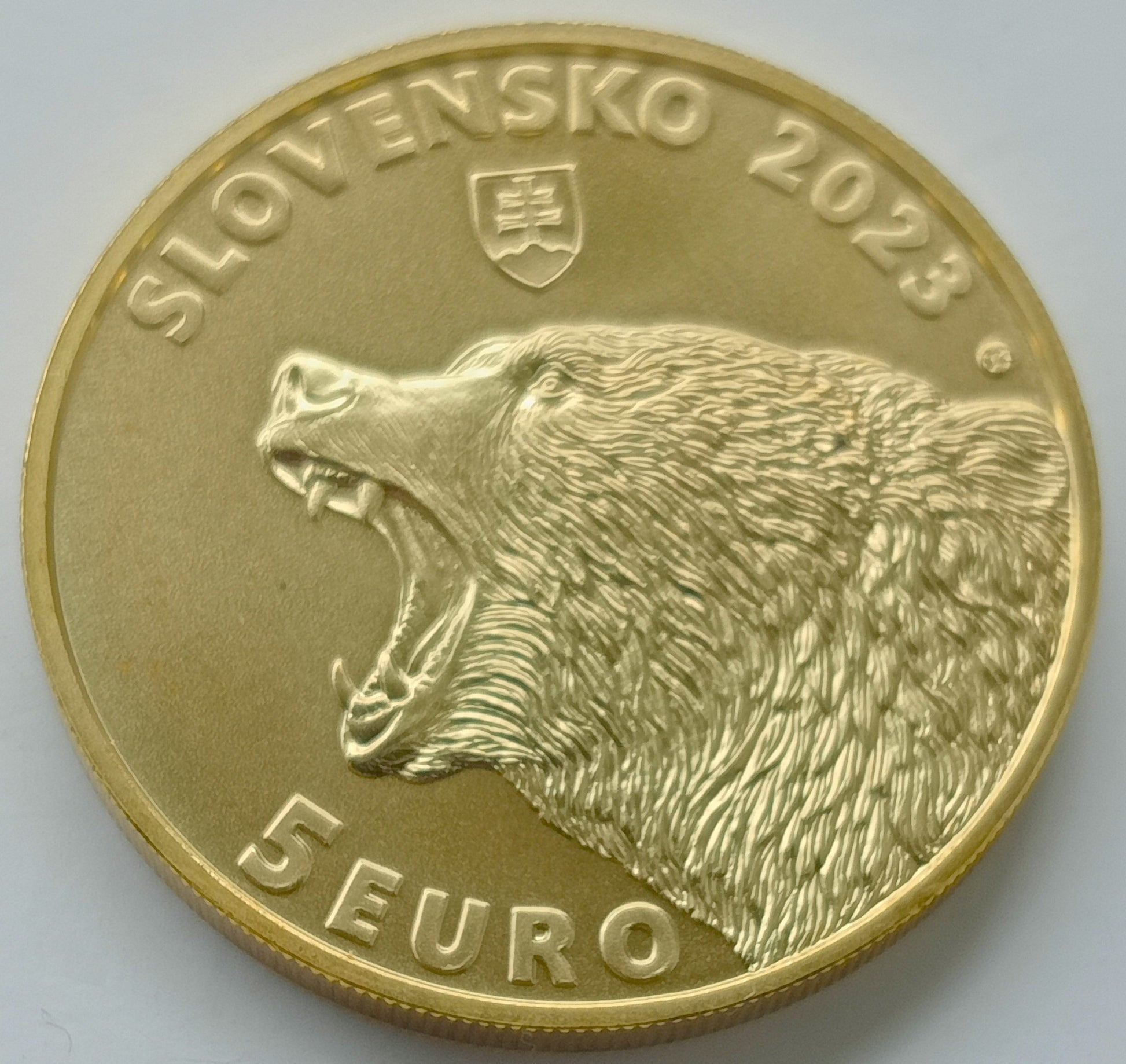 Awers: głowa niedźwiedzia brunatnego z groźnie otwartą paszczą; u góry herb Słowacji, po prawej stronie znak mennicy mennicy. U góry nazwa stanu i data SLOVENSKO 2023 (Słowacja), u dołu nominał 5 EURO.