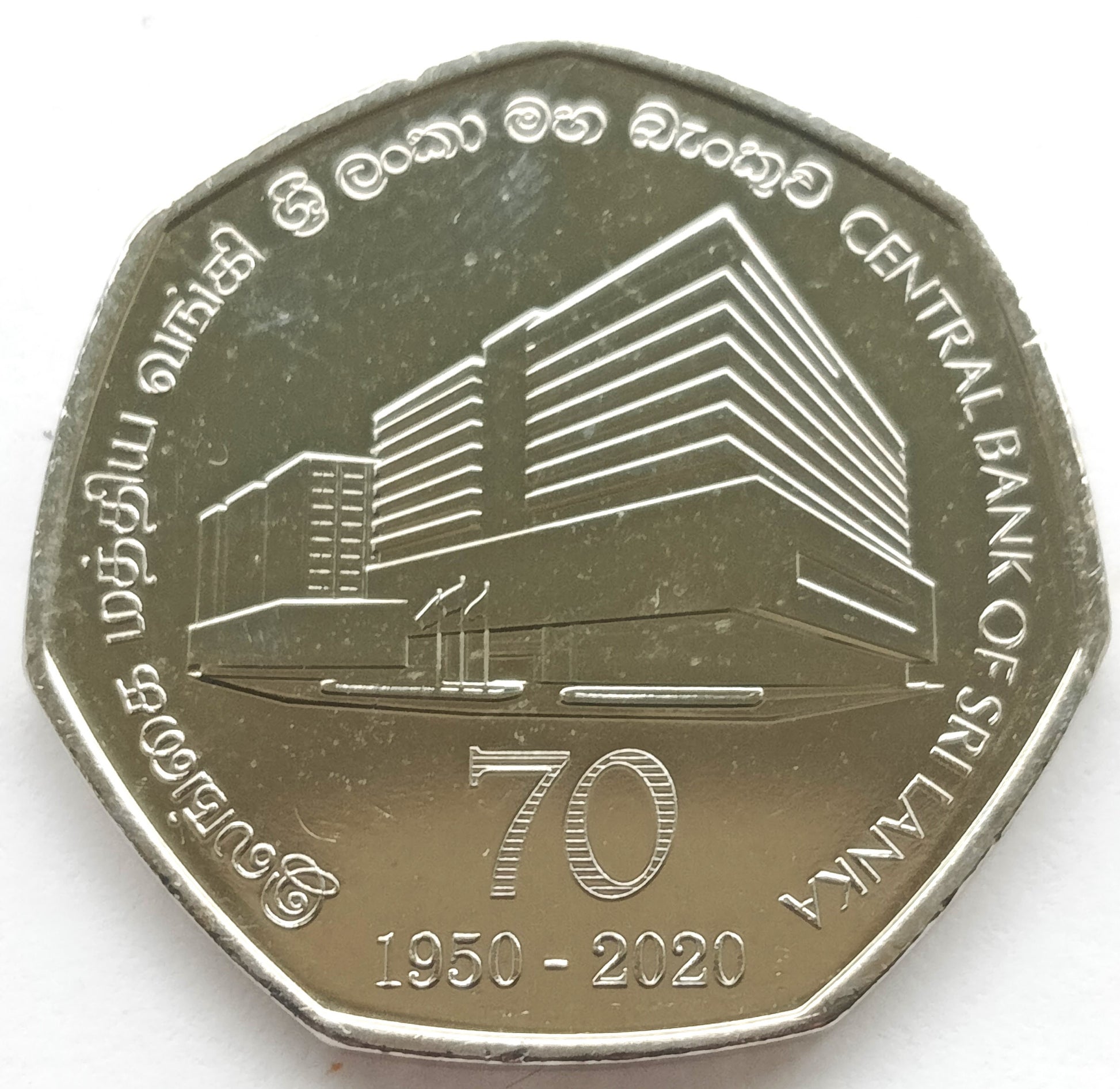 Awers: Budynek siedziby Centralnego Banku Sri Lanki z dużymi cyframi „70” i datami „1950-2020”. Temat w języku syngaleskim, tamilskim i angielskim „CENTRAL BANK OF SRI LANKA” po angielsku po prawej stronie wzdłuż obwodu.