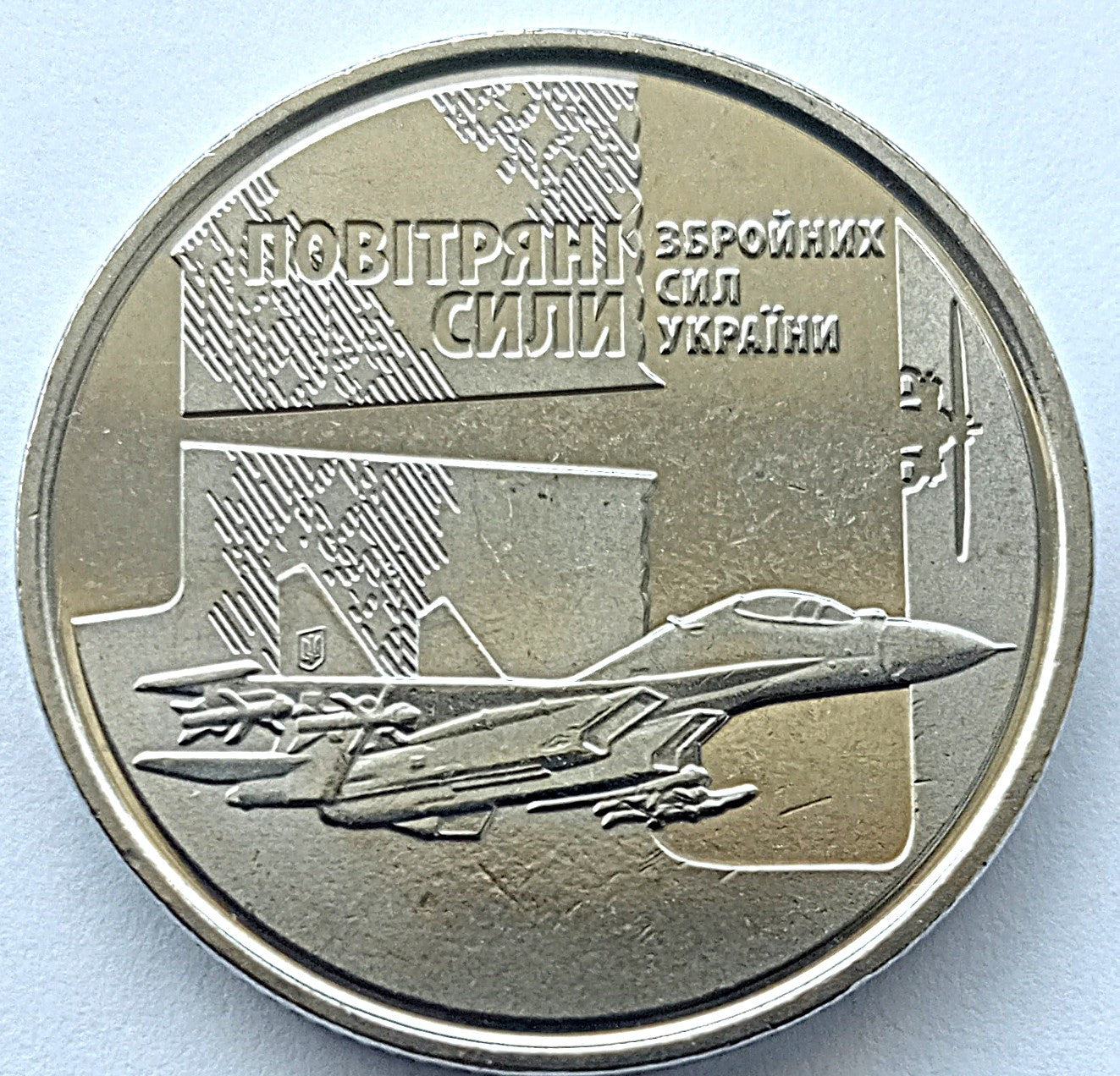 Rewers: Samolot bojowy Sił Powietrznych Sił Zbrojnych Ukrainy na tle lustrzanego konturu samolotu i napisów u góry: „Повітряні / сили” (Powietrze / Siły Zbrojne) (na matowym tle) , „ЗБРОЙНИЙ / СИЛ / УКРАЇНА” (Zbrojne / Siły / Ukraina) (na tle obrysu samolotu).