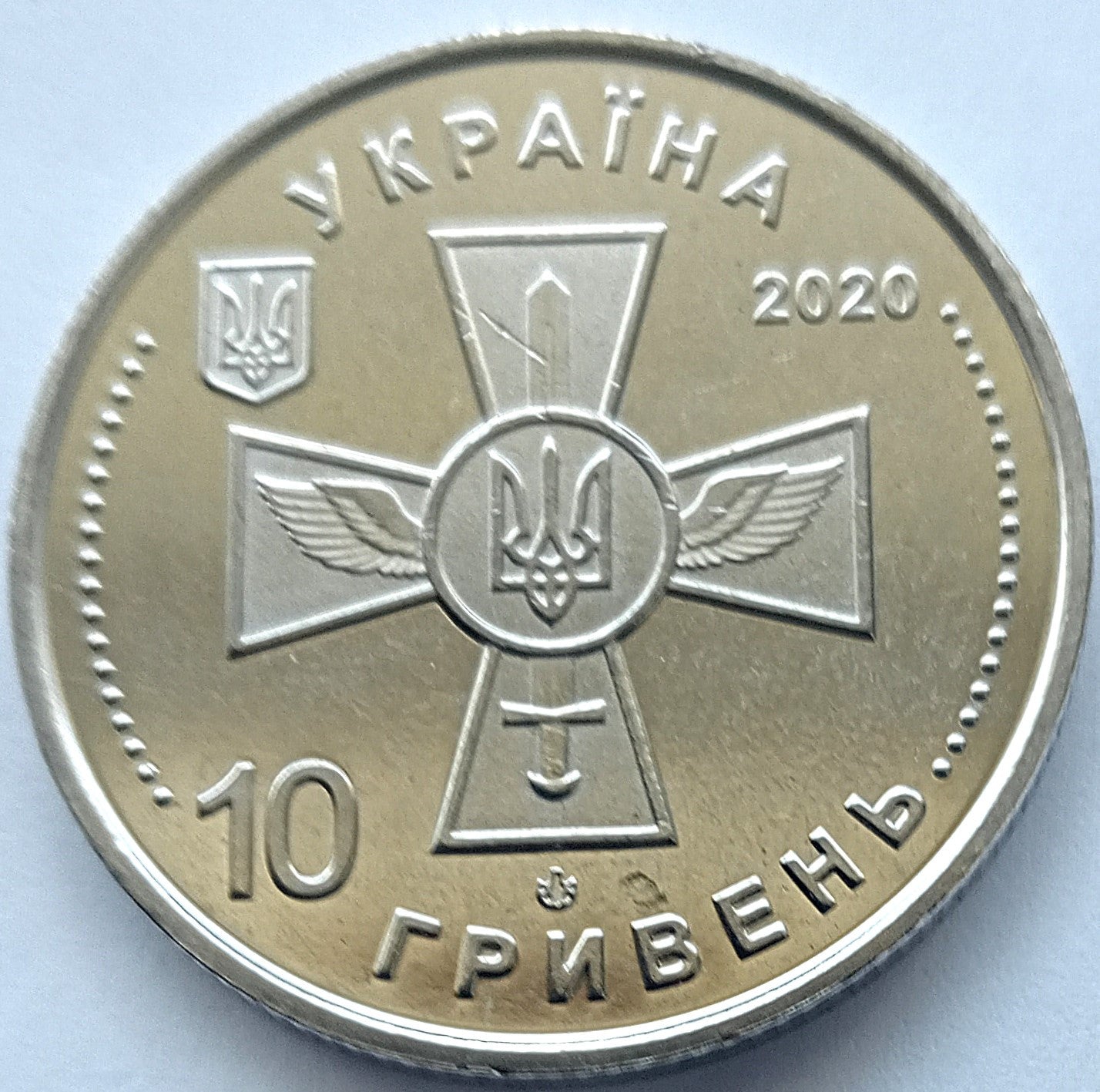 Awers: Małe godło państwowe Ukrainy (lewa), napis "УКРАÏНА" (Ukraina) (u góry półkolem); rok wybicia 2020 (po prawej); w centrum - wizerunek godła Lotnictwa Sił Zbrojnych Ukrainy, pod którym - logo Banknotów-Mennicy Narodowego Banku Ukrainy; denominacja (poniżej) „10 ГРИВЕНb” (10 Hrywny).