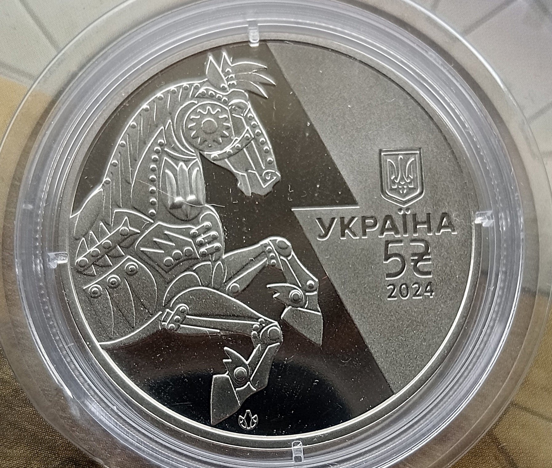 Awers: Stylizowany wizerunek konia stawiającego dęba, wykonany z płyt pancernych nitowanych ze sobą. Po prawej stronie małe godło państwowe Ukrainy, nazwa państwa UKRAINA, nominał 5 ₴ (5 hrywien) i data poniżej 2024 r. Na dolarze znak mennicy Narodowego Banku Ukrainy (lilia).
