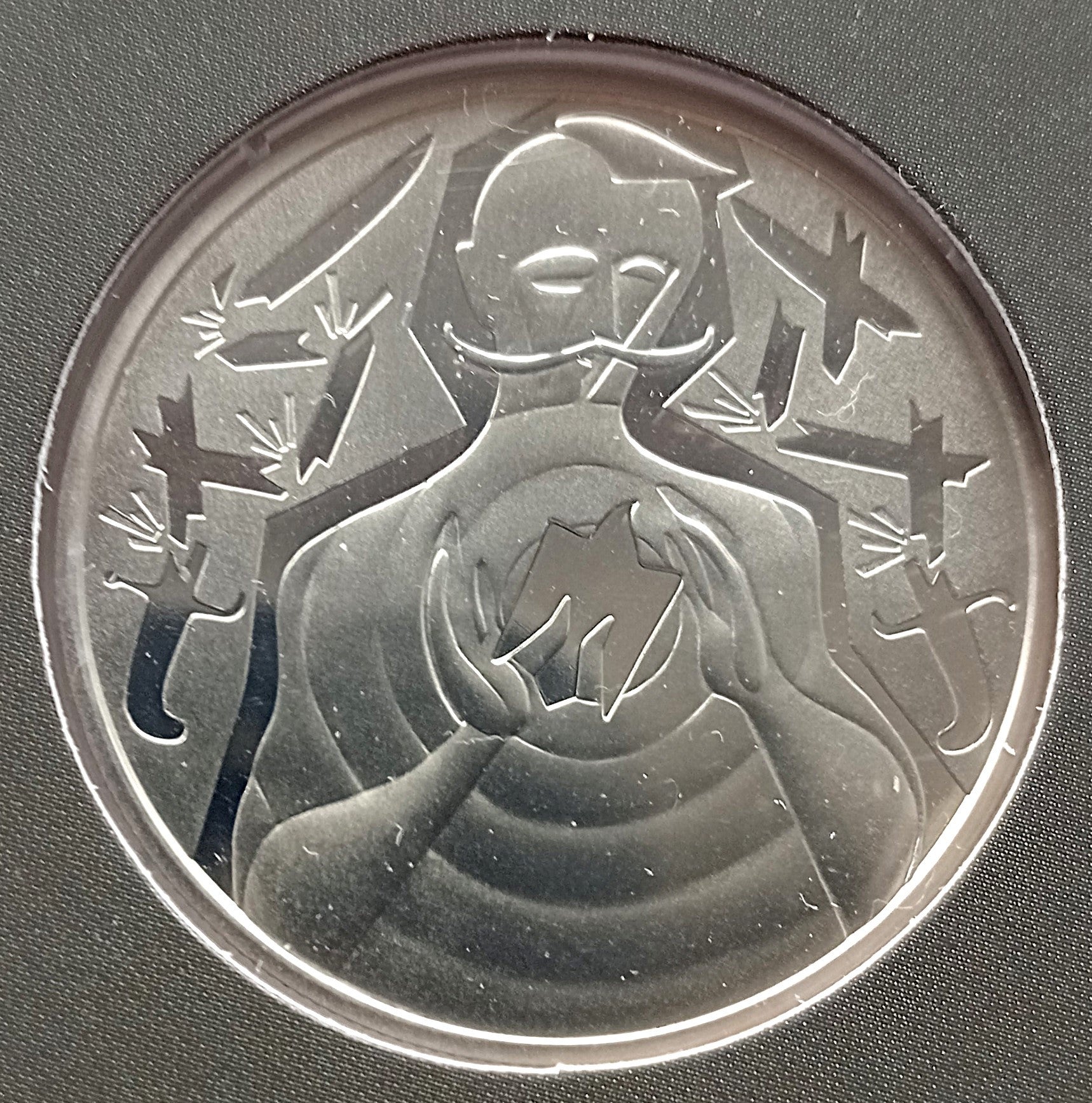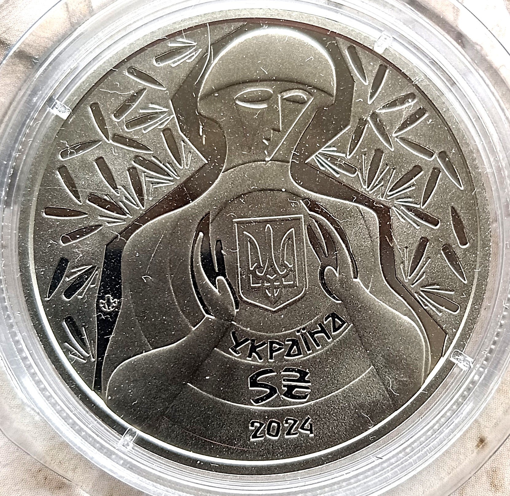 Awers: Stylizowany wizerunek żołnierza, który ostrożnie trzyma i chroni mały herb Ukrainy. Na matowym tle widoczne są wrogie kule odbijające się od żołnierza, nie trafiające w „ukraińską duszę”; nominał u dołu 5 ₴ (5 hrywien), pod spodem data 2024. Znak mennicy Narodowego Banku Ukrainy (Lilia) po lewej stronie.