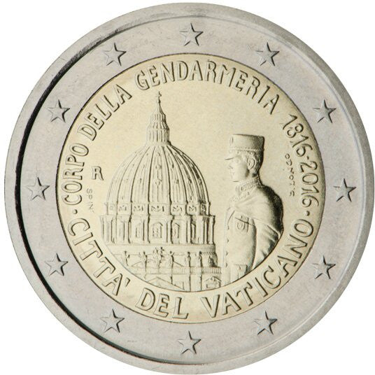 Gwardia Szwajcarska jest formacją pełniącą straż przy papieżu. Na awersie poświęconej jej monety widać postać jej żołnierza na tle Bazyliki Świętego Piotra. Z lewej oznaczenie rzymskiej mennicy "R" i biegnący półkoliście w górę napis „CORPO DELLA GENDARMERIA 1816–2016” („KORPUS ŻANDARMERII 1816–2016”). Na dole nazwa państwa emitującego „CITTÀ DEL VATICANO” („PAŃSTWO WATYKAŃSKIE”). Po prawej obok lat oznaczenie projektantki „D. LONGO”.