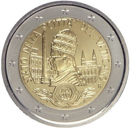 Państwo Watykańskie zostało utworzone z Włoch na bazie traktatu laterańskiego w 1929 roku. 90 lat później wyemitowało z tej okazji okolicznościowe monety euro. W środkowej części awersu widnieje profil papieża Piusa IX. Od lewej w górę napis „STATO DELLA CITTÀ DEL VATICANO” („PAŃSTWO WATYKAŃSKIE”) i znak mennicy z Rzymu „R”. W ozdobnym motywie na dole lata 1929-2019 i nazwisko grawerki Danili Fusco. Projektantką jest Maria Angela Cassol.